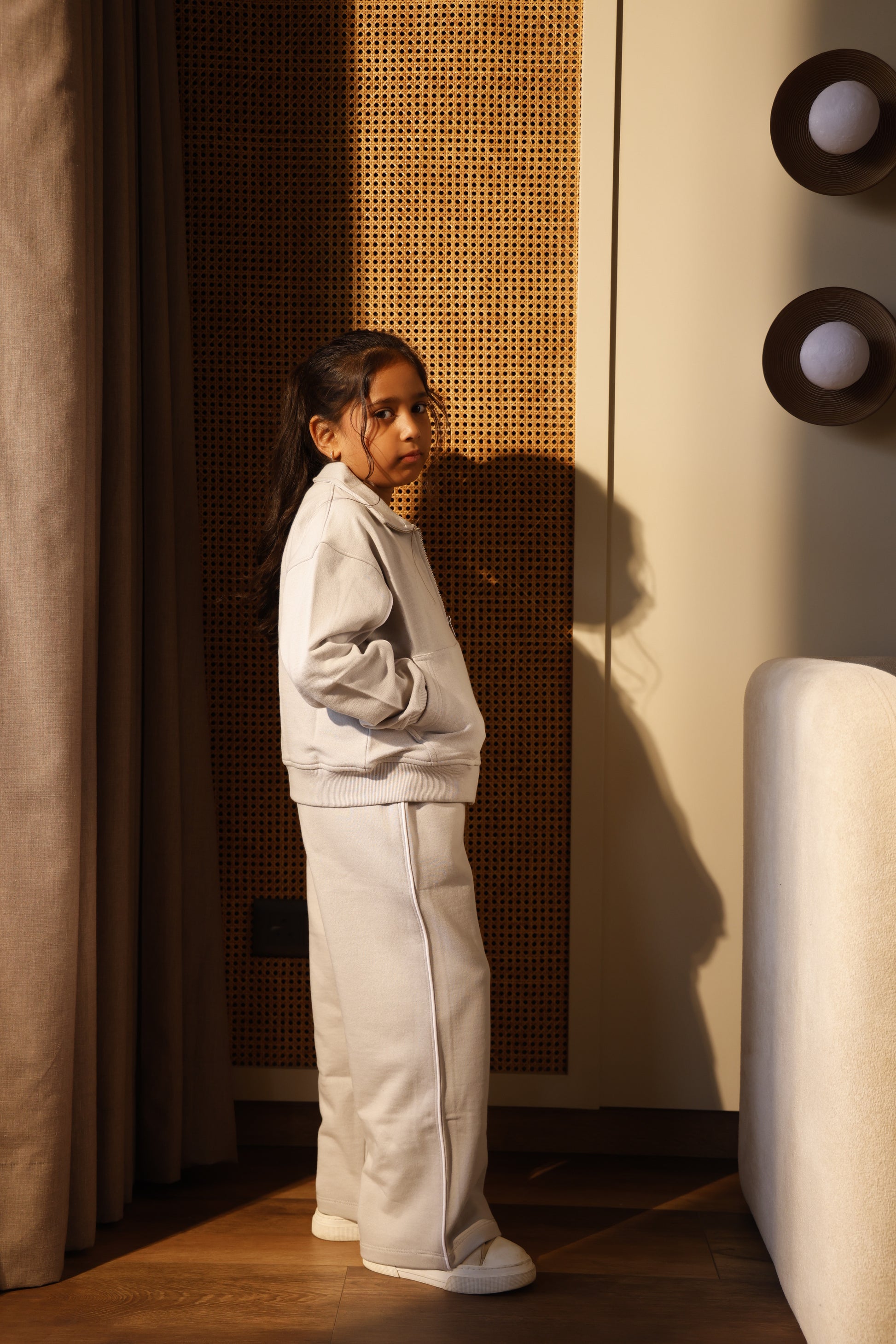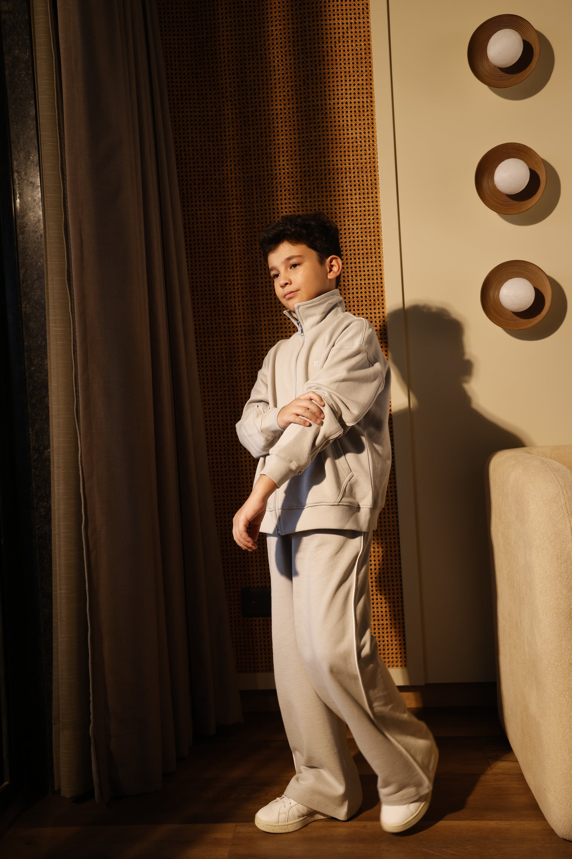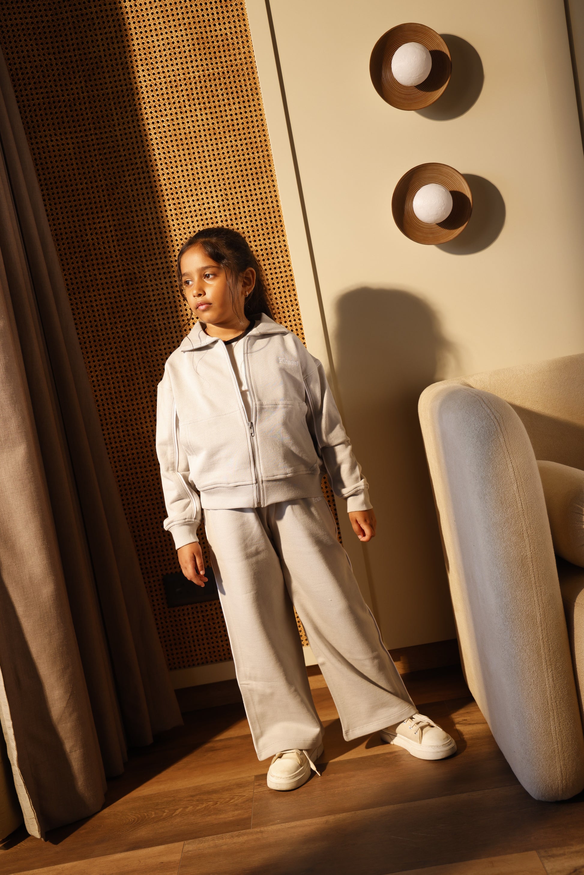 A RELAXED FIT set with dropped shoulders and a slightly longer zipper silhouette that reaches the hips. Straight-leg trousers with an elasticated waistband.