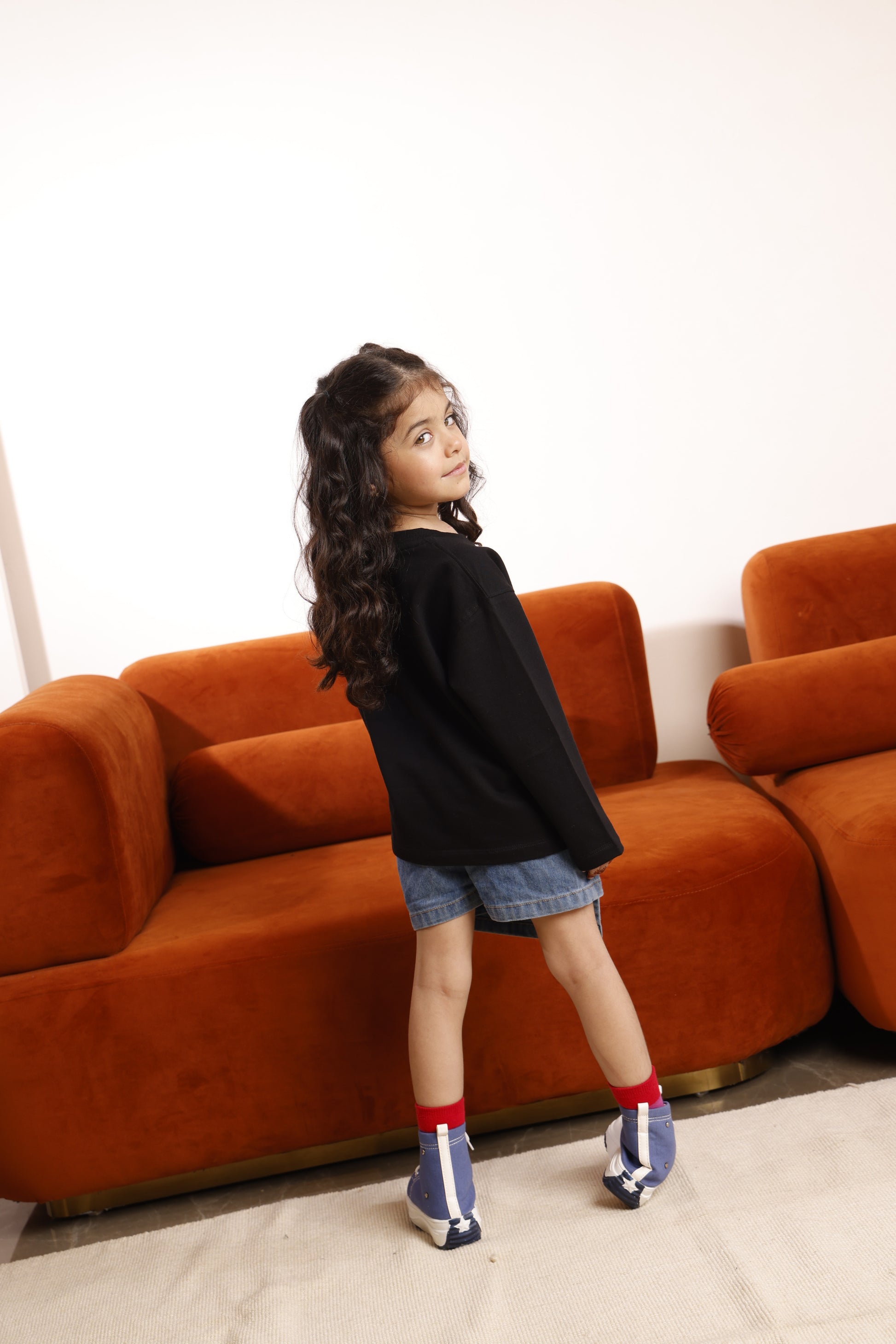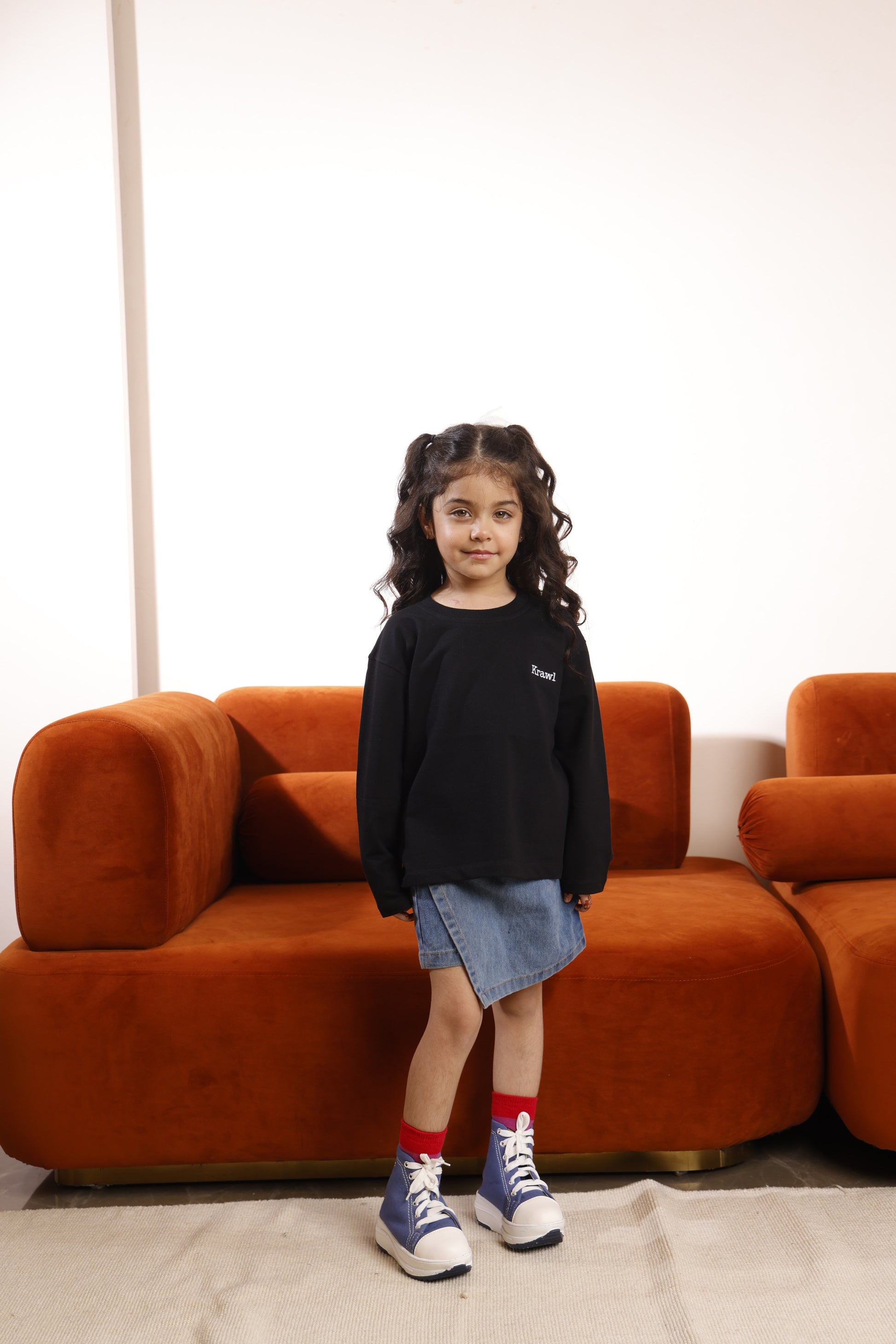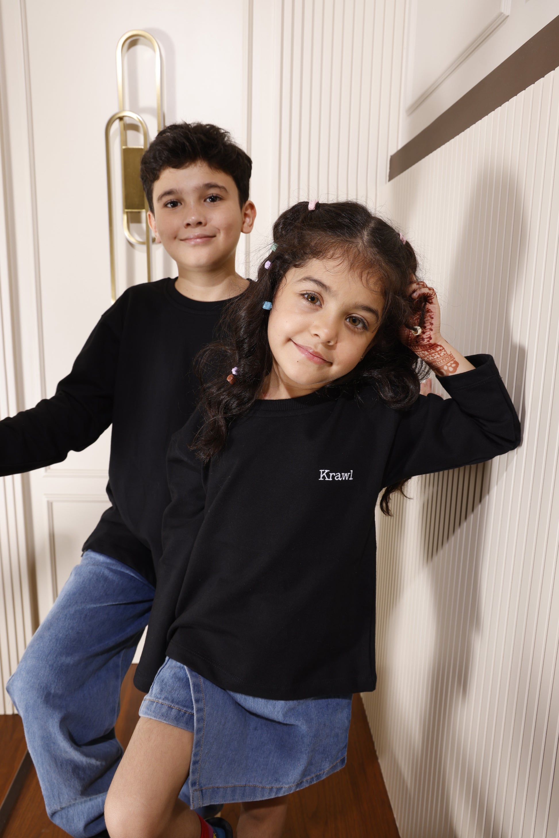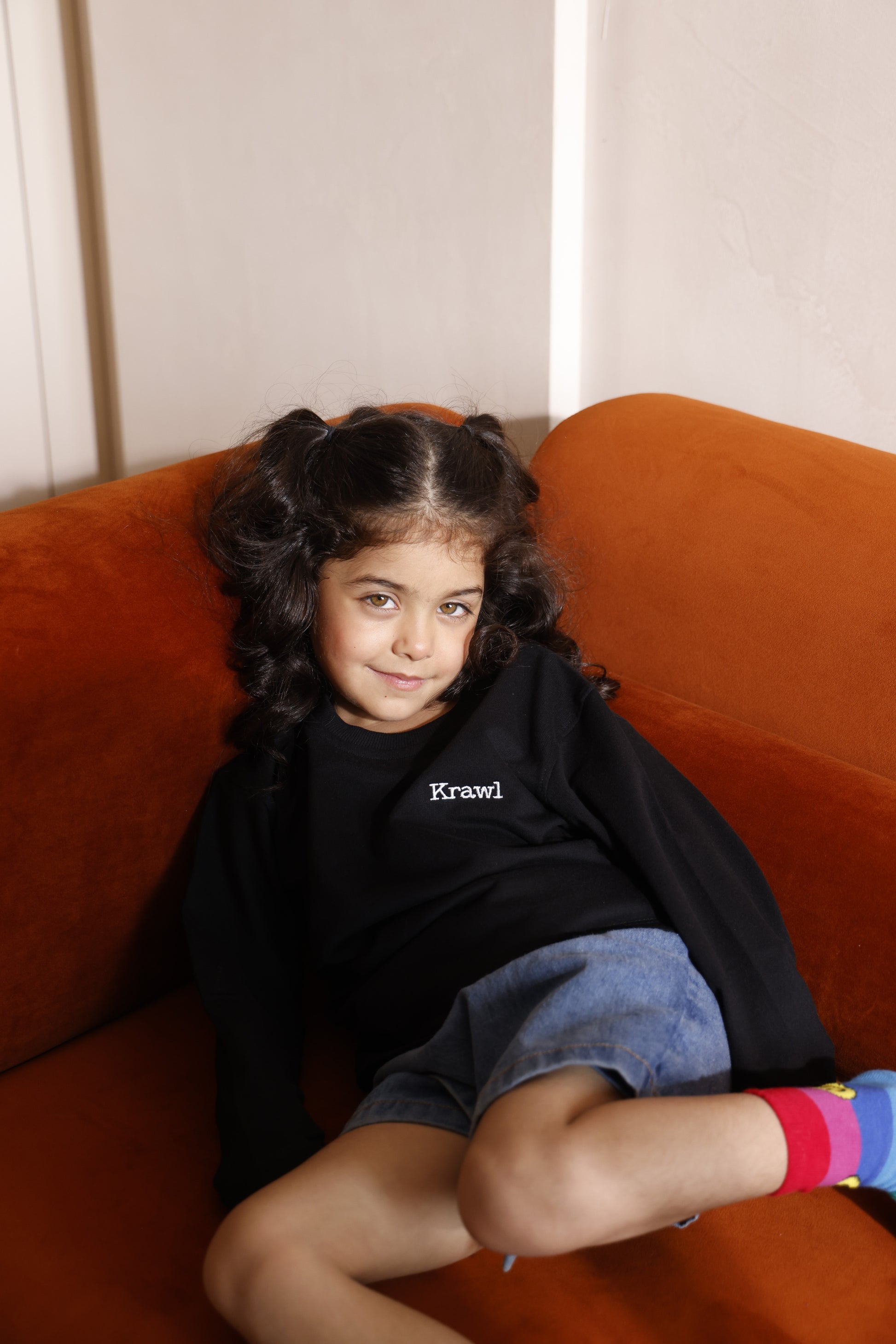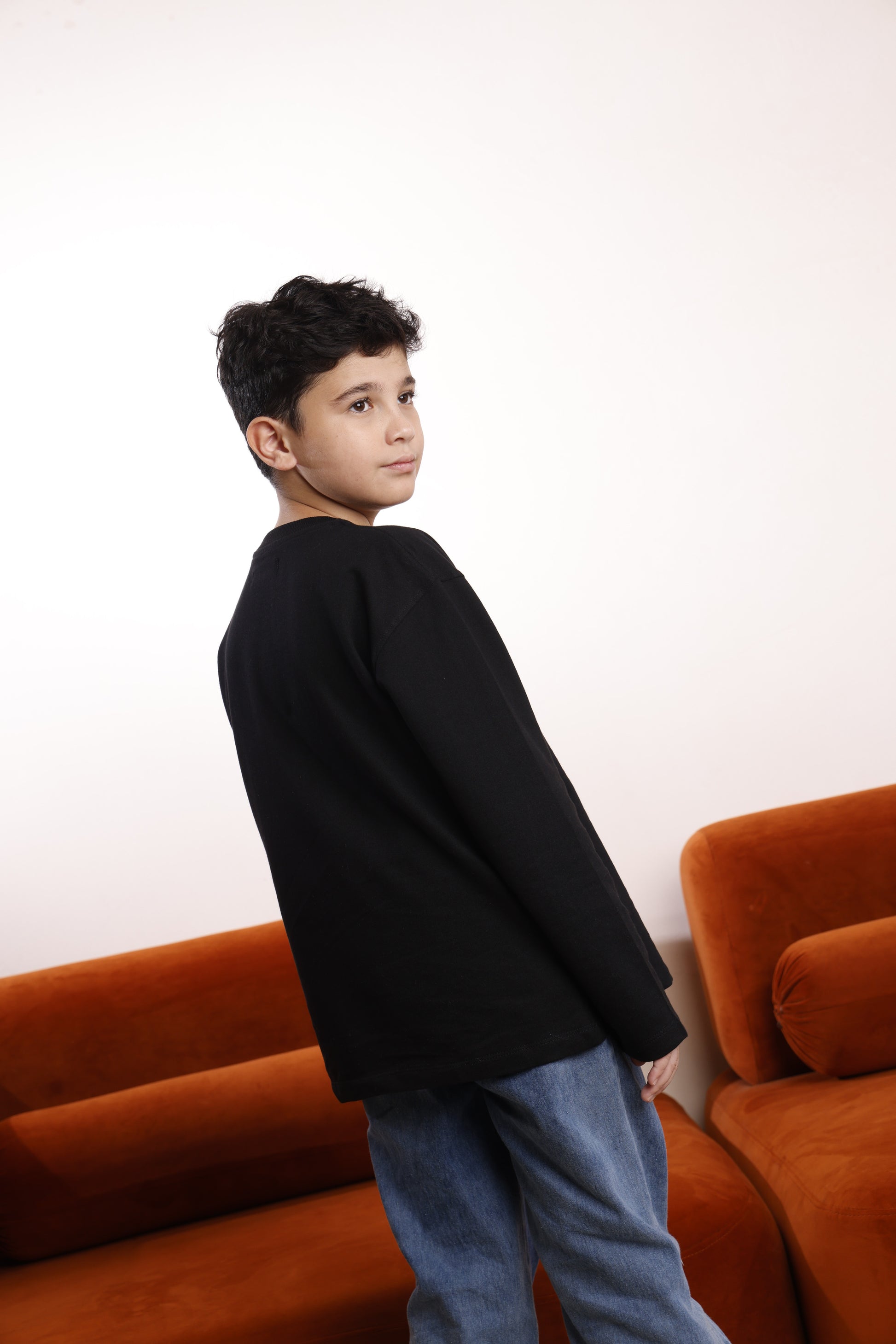 A long sleeve tee with an embroidered accent logo. A casual, relaxed fitting style with dropped shoulders and a round neckline.